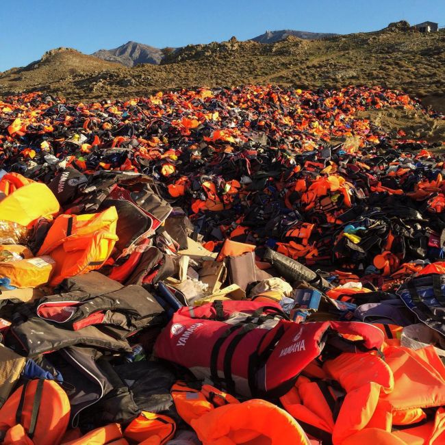 Неподалеку от деревни Моливос на склоне холма они составили гигантский символ мира из спасательных жилетов, брошенных беженцами. Инсталляция создавалась в память о людях, которые не смогли достичь заветного берега в попытке бегства от войны, разрушения и смерти. Таким образом активисты хотели напомнить о риске, на который идут мигранты в попытке обрести право на жизнь. По последним данным за минувший год в Европу через Средиземное море прибыло более миллиона беженцев. Более 3700 человек утонули или погибли в пути.