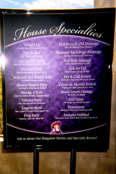 Наши специалитеты — это наше секс-меню со списком всех сексуальных услуг, предоставляемых в Sheri’s Ranch. Я выполняю большинство услуг в зависимости от цены, которую клиент готов заплатить. Самая популярная — это «половина на половину», в которую входит традиционный и оральный секс. Одни из моих любимых — шоу «девушка с девушкой», пенная вечеринка в ванной и ролевые игры.