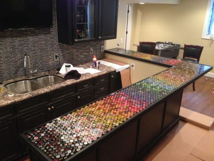Используя коллекцию бутылочных крышек, которая собиралась в течение 5 лет, парень оборудовал свой домашний бар оригинальной столешницей. Процесс создания этого декоративного предмета интерьера запечатлен в небольшом фотоотчете.