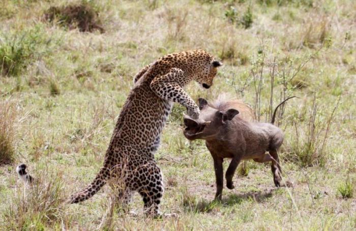 Одно из главных условий удачной охоты — терпение и маскировка, этими навыками в совершенстве владеет леопард. Большая кошка залегла в ожидании добычи, на ее счастье рядом проходил бородавочник. Леопард взмыл в воздух в стремительной атаке, кабан слегка остолбенел от неожиданности, но быстро придя в себя, попытался скрыться бегством. Однако из цепких лап леопарда вырваться совсем непросто, кабанчик стал вкусным обедом большой кошки. Эти драматические кадры сделал фотограф Питер Томпсон (Peter Thompson) в Национальном заповеднике Масаи Мара в Кении.