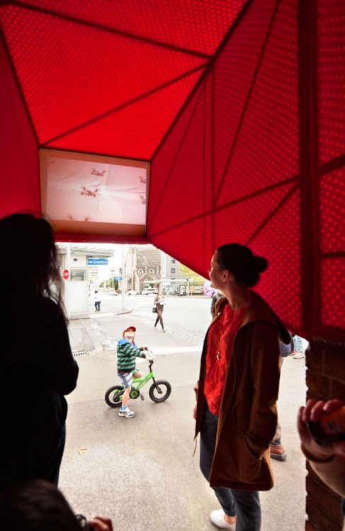 Кинотеатр расположен в Окленде, Новая Зеландия на ступенях прямо в центре оживленного пешеходного перекрестка. Ранее это место было серое и тоскливое. Автобусные остановки и прачечные нагнетают обстановку, серости в враждебности. Но теперь этот кинотеатр под названием Stairway Cinema притягивает людей и площадь его составляет всего 5 кв.м. Показывают там популярные видео из социальных сетей. Интересно там хентай показывают? ;)