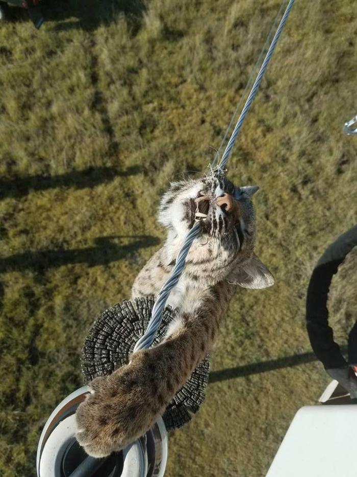 Дикий степной кот повторил судьбу леопарда, забравшегося на опору ЛЭП. Животное, по неизвестной причине вскарабкавшееся на столб, зацепилось пастью и лапой за провод и погибло от удара электрическим током, а его задняя лапа оплавилась до кости.