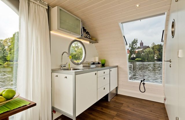 За эти деньги покупатель получает небольшой плавучий дом с внутренним пространством в 16 квадратных метров. Плавучий дом включает гостиную с панорамными окнами, кухню, санузел с душем и спальню. Кроме того здесь есть терраса для отдыха и площадка для солнечных ванн на втором ярусе. За дополнительную плату можно расширить комплектацию плавучего дома, добавив сюда, например, сауну.